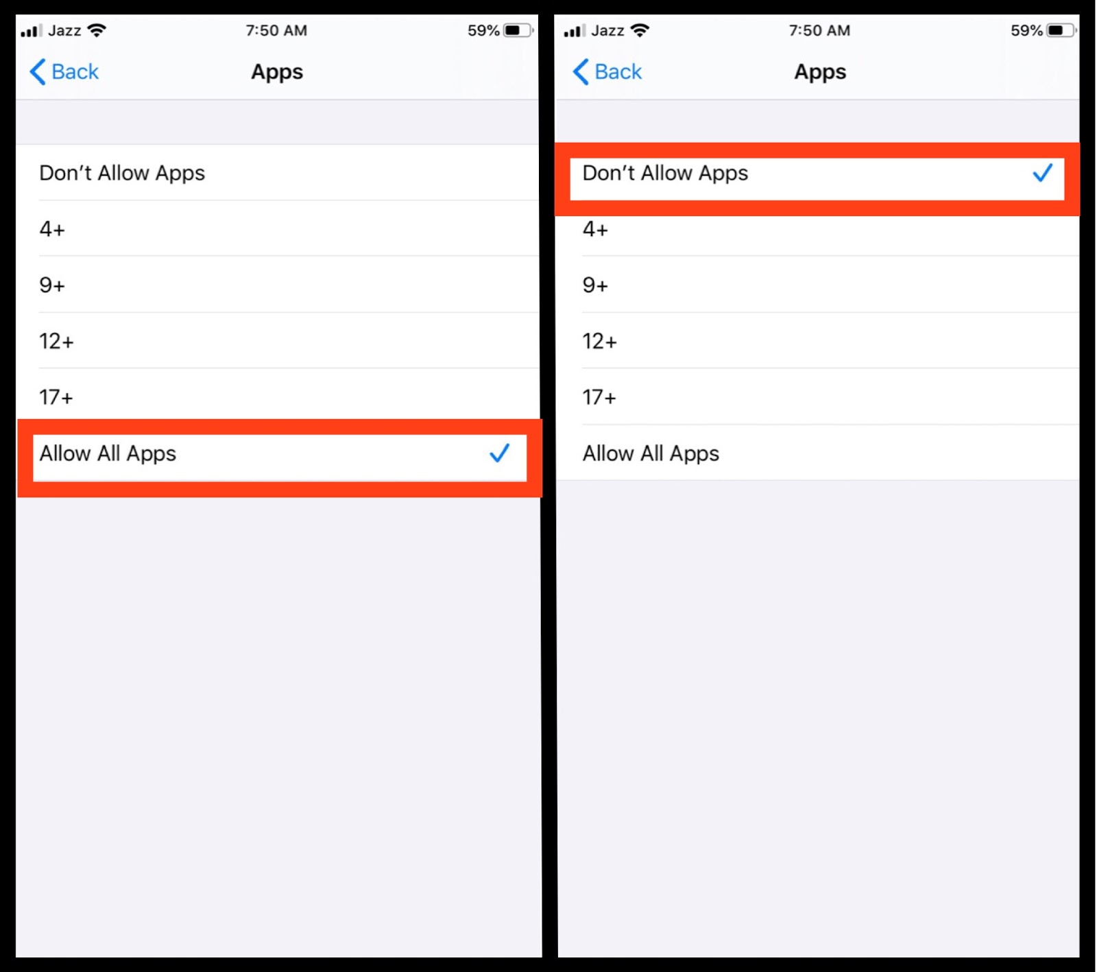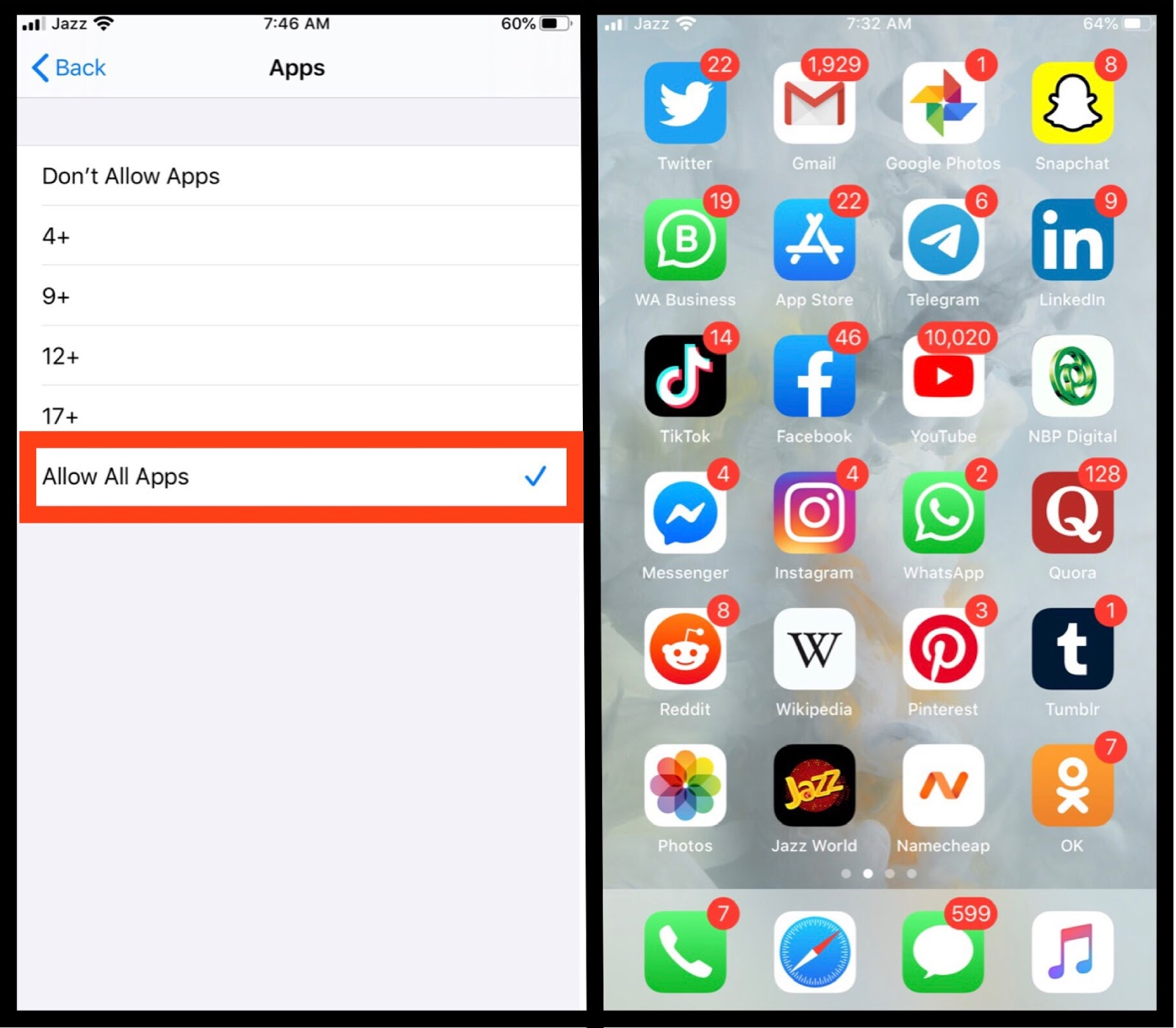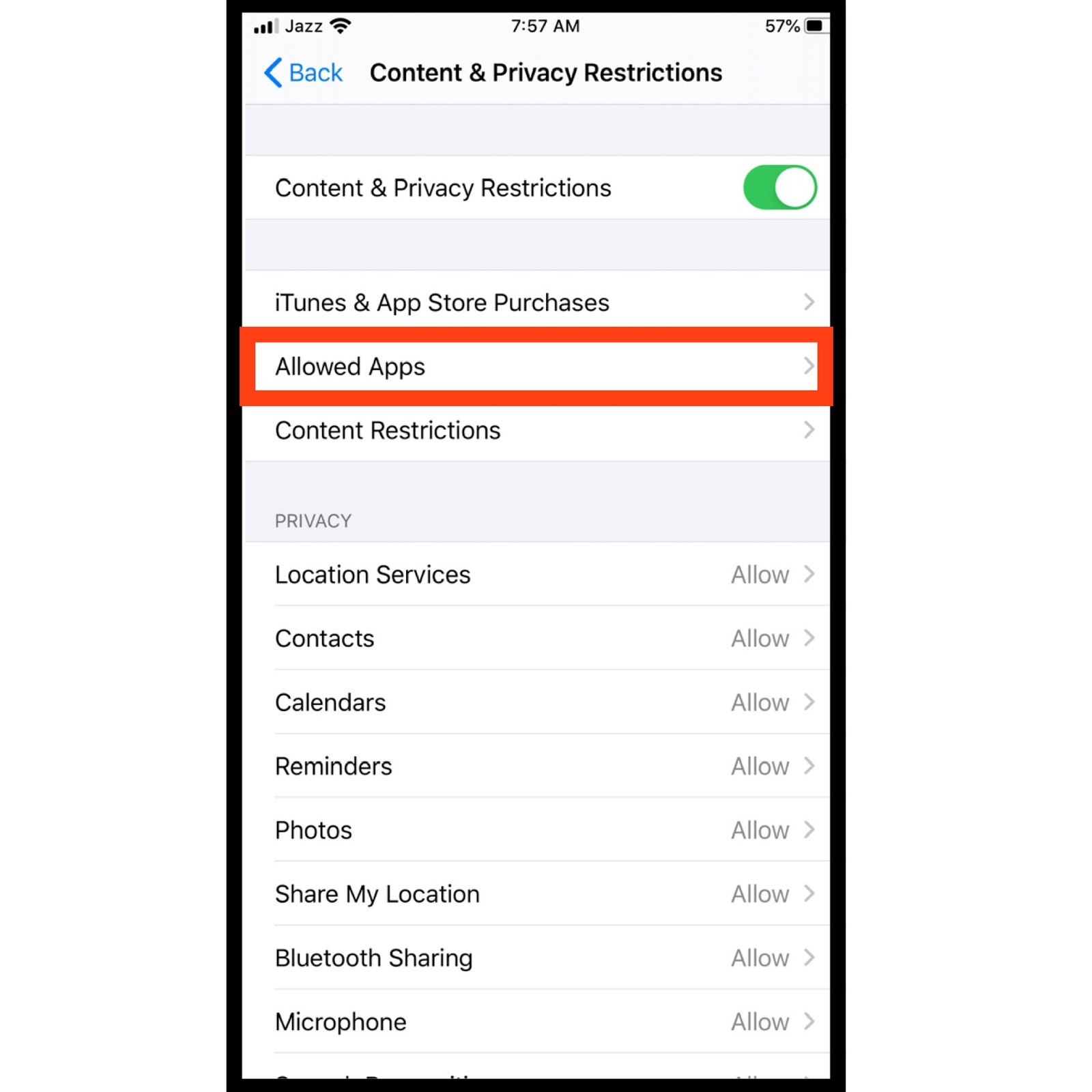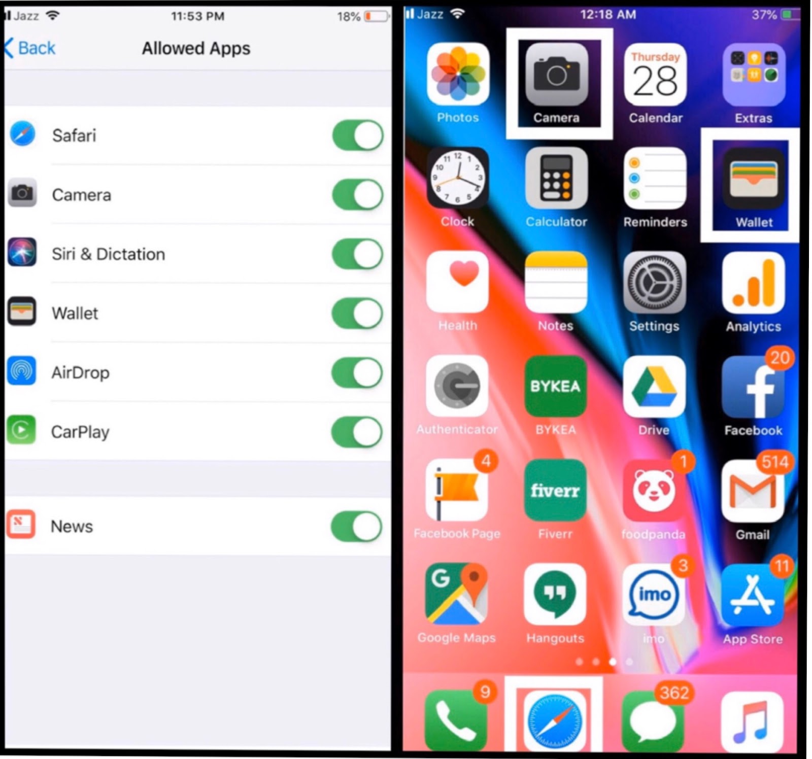 - ● Allowed Apps are the iPhone stock apps these are not downloaded from App Store. For example, Safari, Camera Siri & Dictation, Wallet, AirDrop, CarPlay, and News, etc.