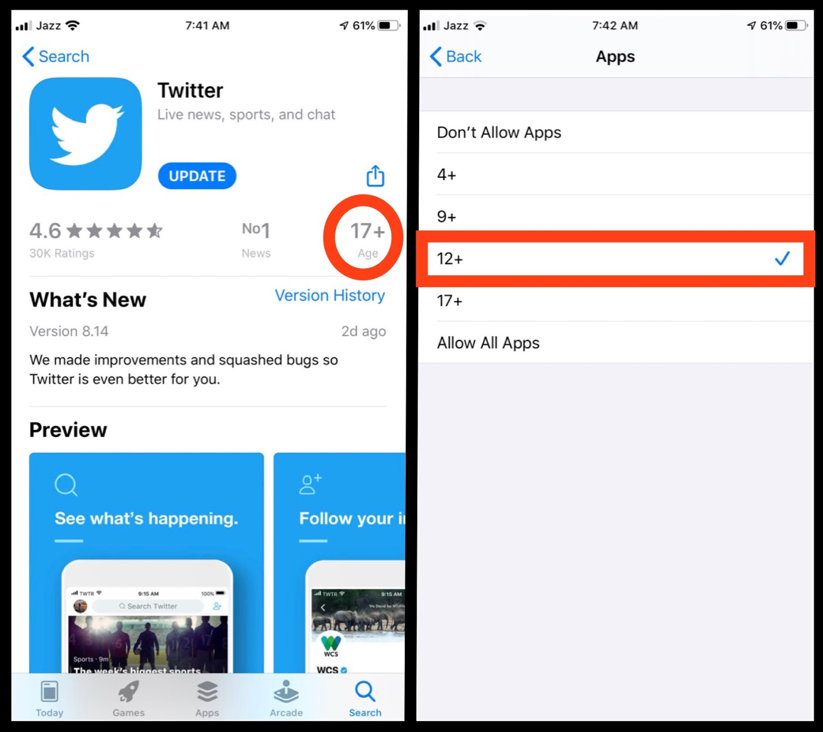 - ● First, go to the App Store and check out the age rating of the app which you want to hide and remember one thing if you hide the 17+ age rating app then all the apps that have 17+ age rating in your device will be hidden.