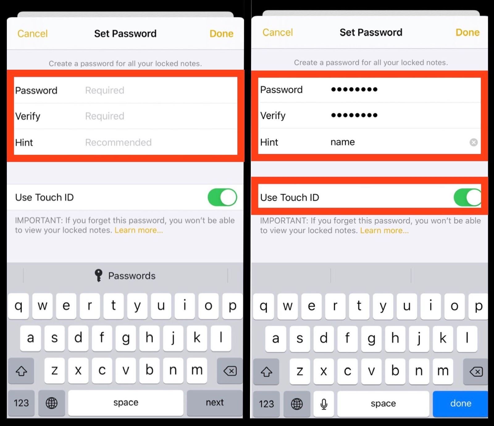- ● To open the locked note on iPhone or iPad click on the note that you have locked and use fingerprint or enter your password to view your note.