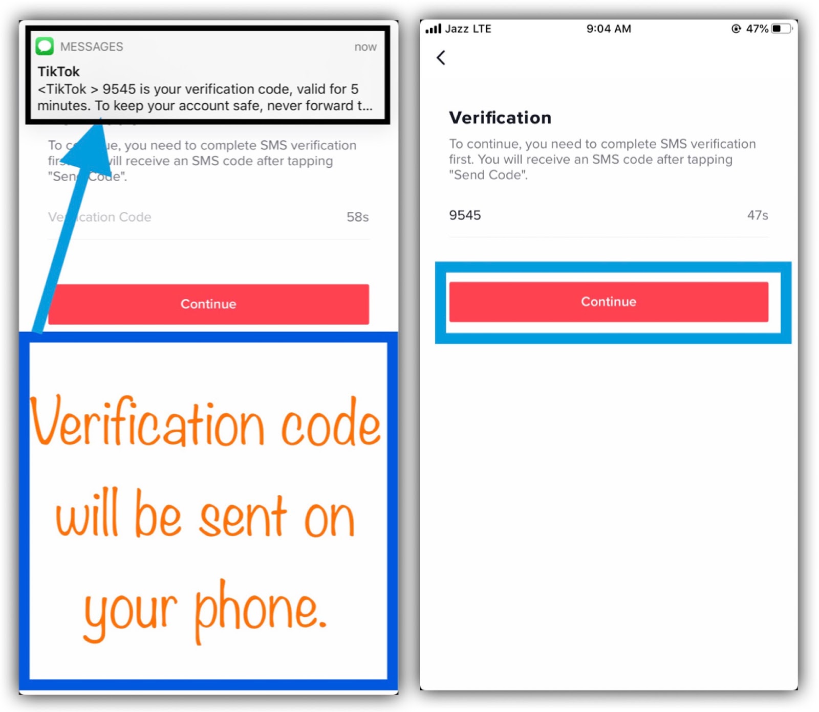 - ● Tiktok will send you a verification code on your phone number, valid for just 5 minutes.