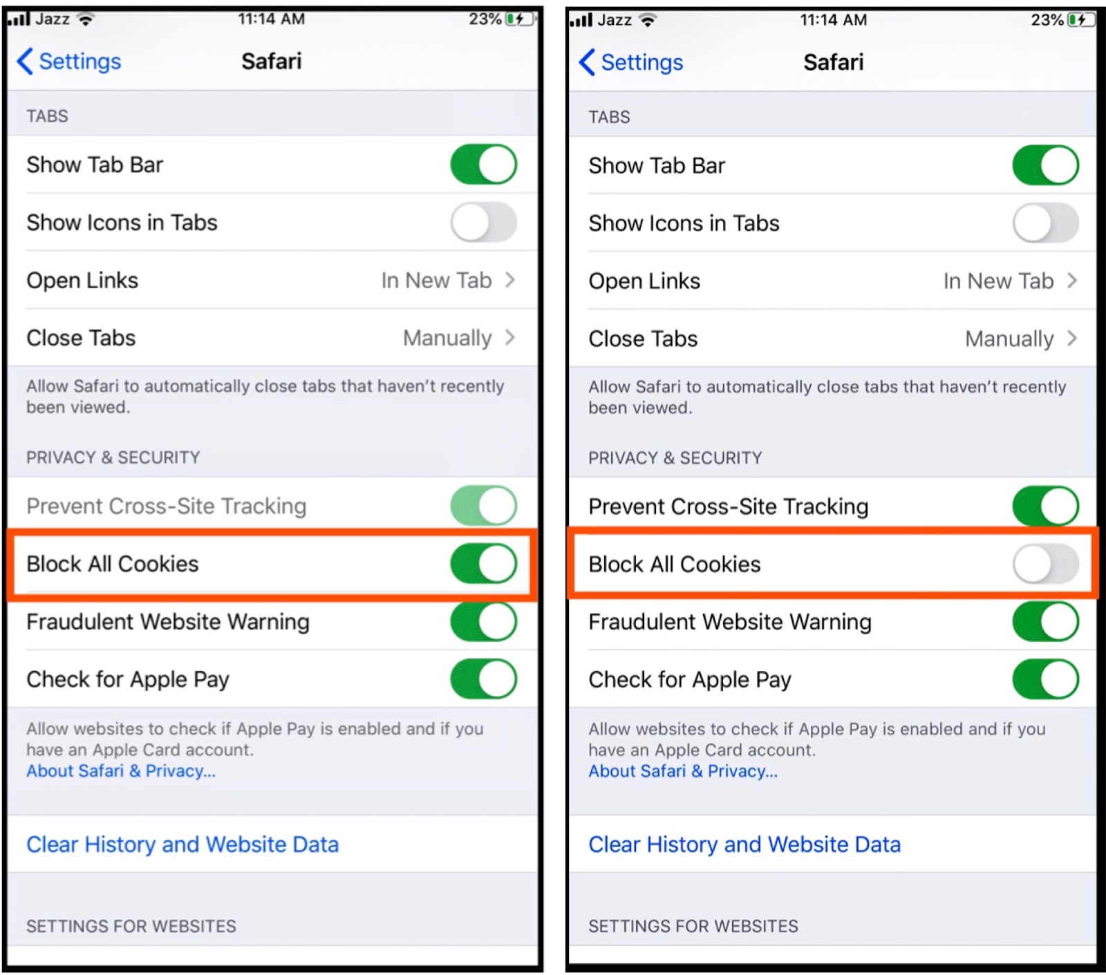 By default, iPhone has a Safari browser. Safari is one of the best secure browsers but we also know browser stores cookies on users' devices.You might think there must be a large difference between cookie settings on Mac and on iPhone. The only difference is that you would not find settings in browsers. You have to go to the internal Settings of the iPhone.