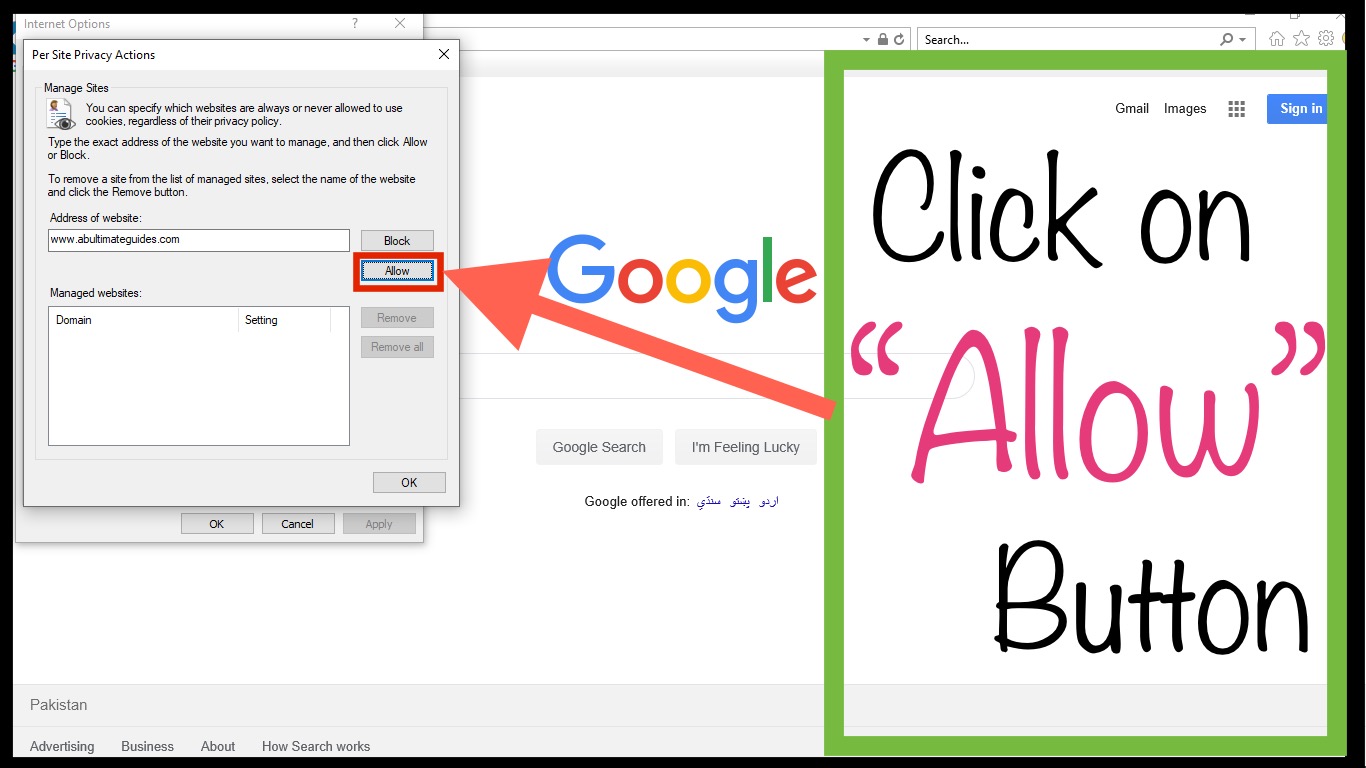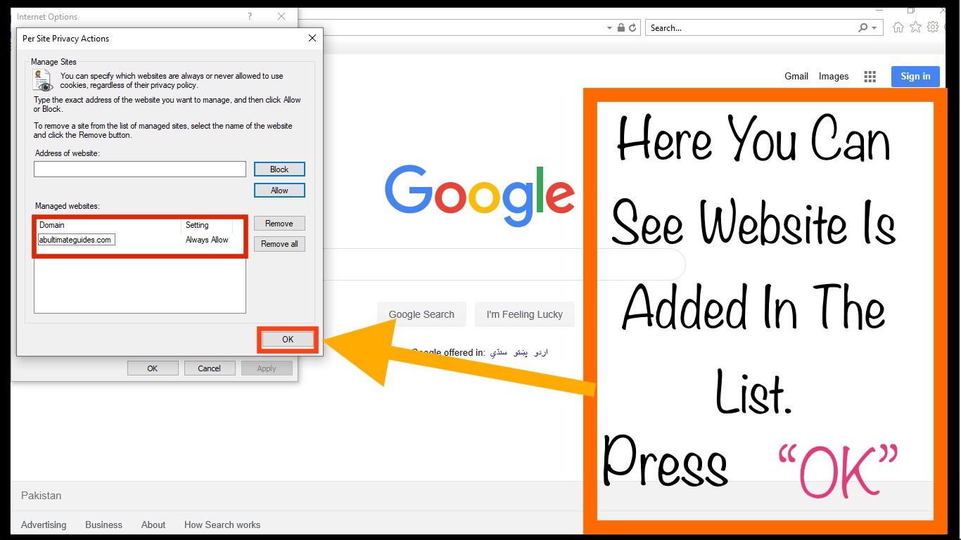 - ● Press "Ok" and that's it you have successfully allowed cookies for a particular website in internet explorer.