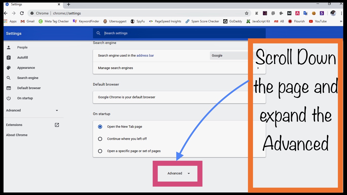 - ● The setting menu will open on the screen. Here on the setting page, you have to scroll down the page to its end. At the end of the page just expand the Advanced ⏷ settings. Once you clicked the Advanced with down arrow another menu with many sections will open.
