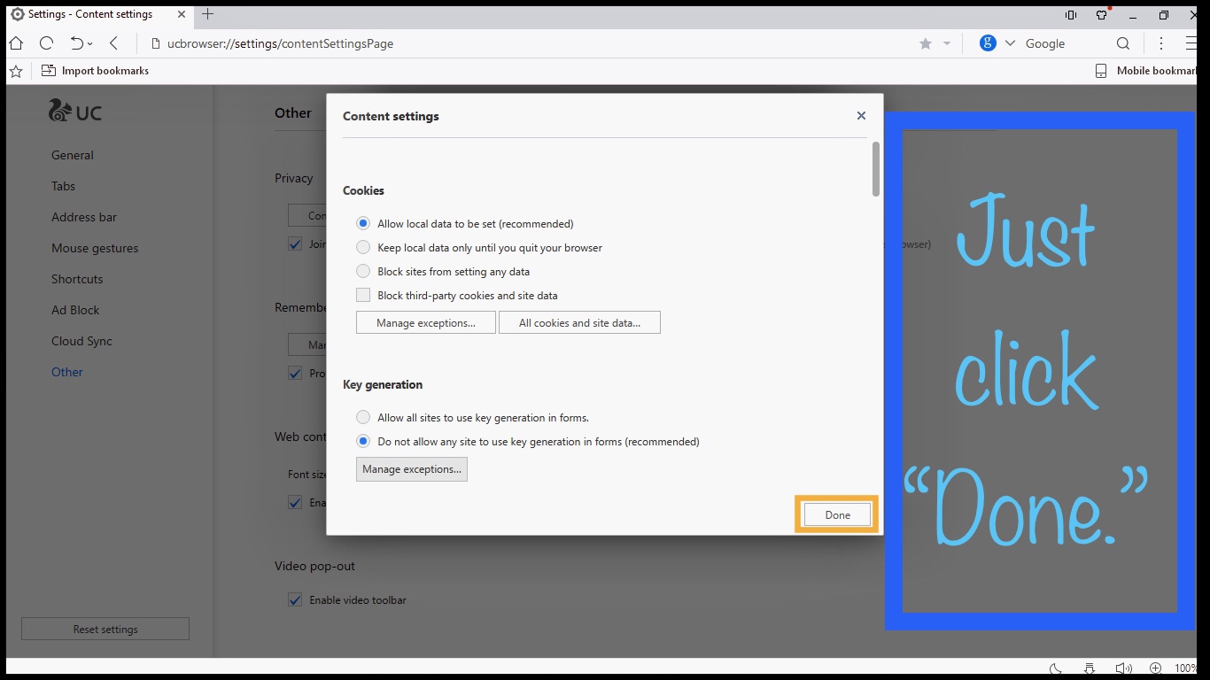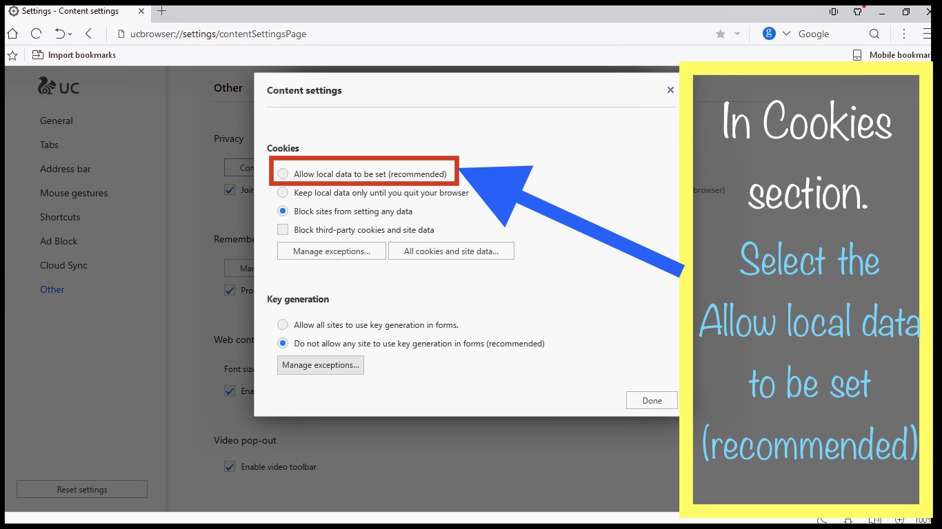- ● So it is quite easy to enable third-party cookies on the UC browser. In the cookies section just check the empty box.