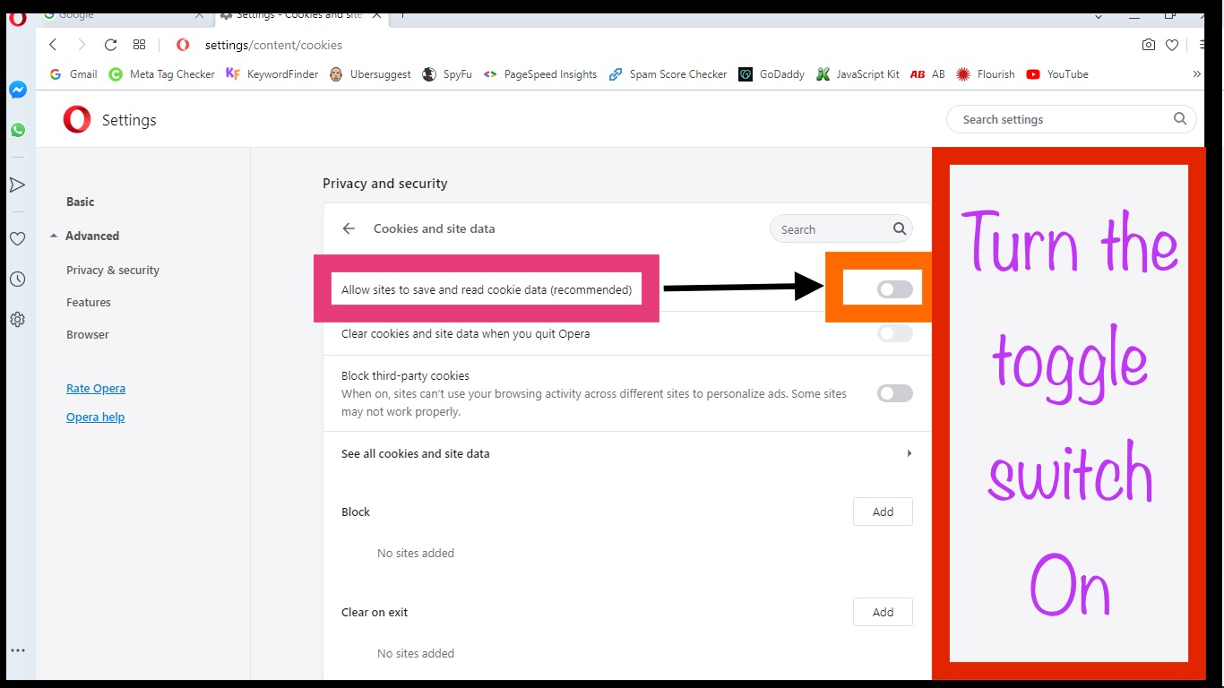 - ● Here you can see in the first option if your cookies and site data is blocked just turn the grey toggle On and change into the blue color.