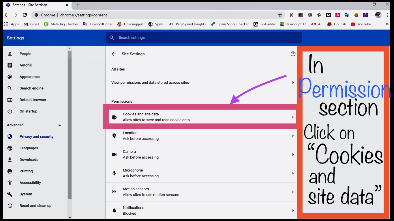 - ● On to the next page that will open click on Cookies and site data in the Permission section.