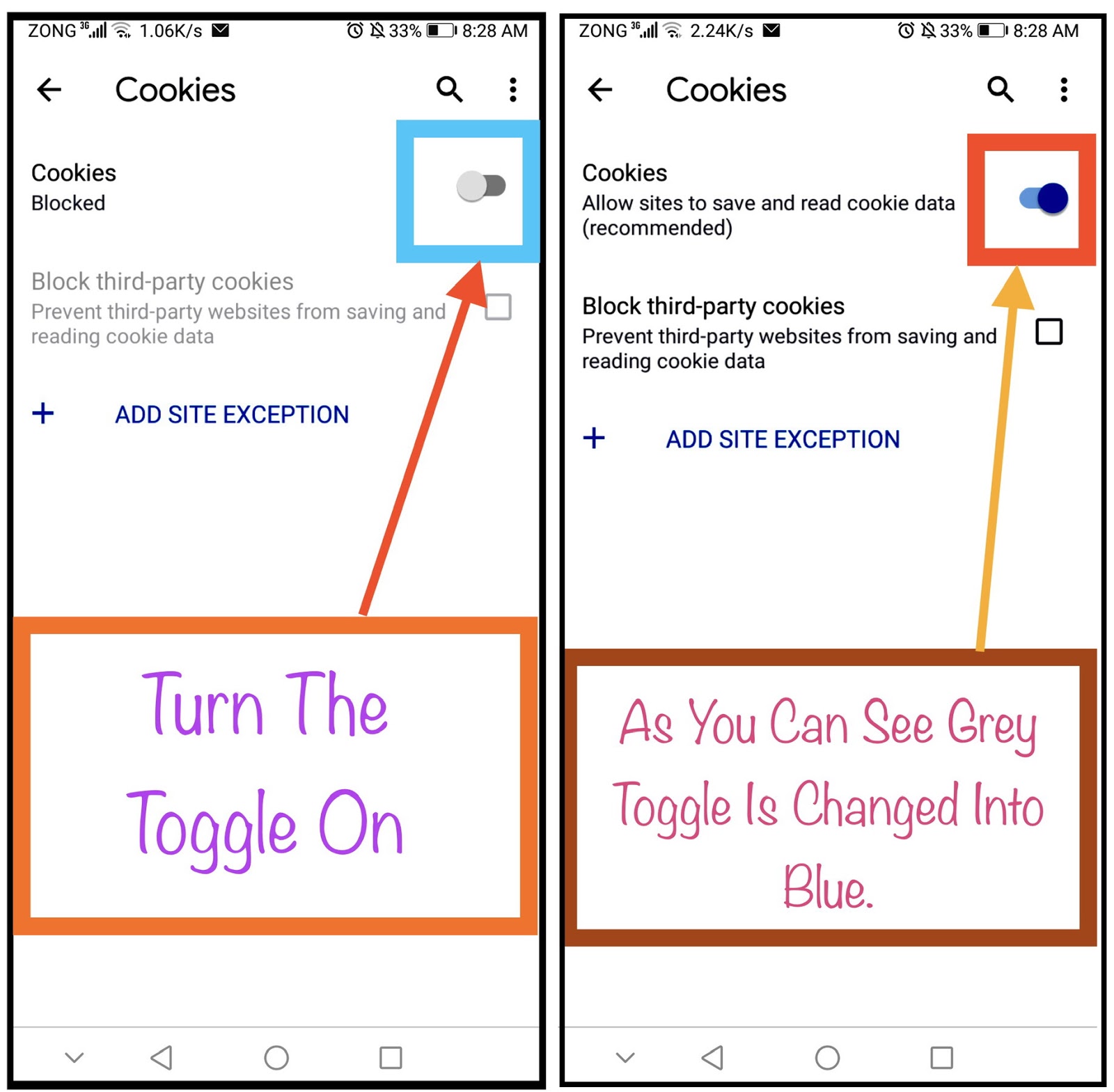 - ● On the Cookies page just turn the toggle On of the cookies it will become blue and now your cookies are enabled, it will enable both first party and third party cookies.