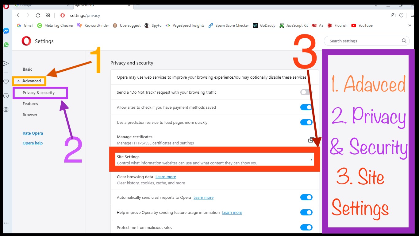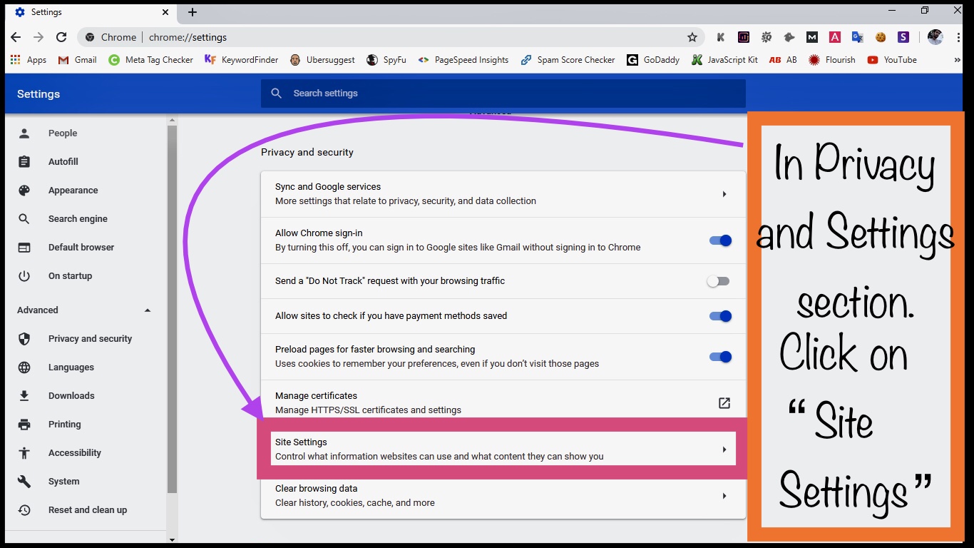 - ● Then you have to Click on Site Settings in the Advanced section.