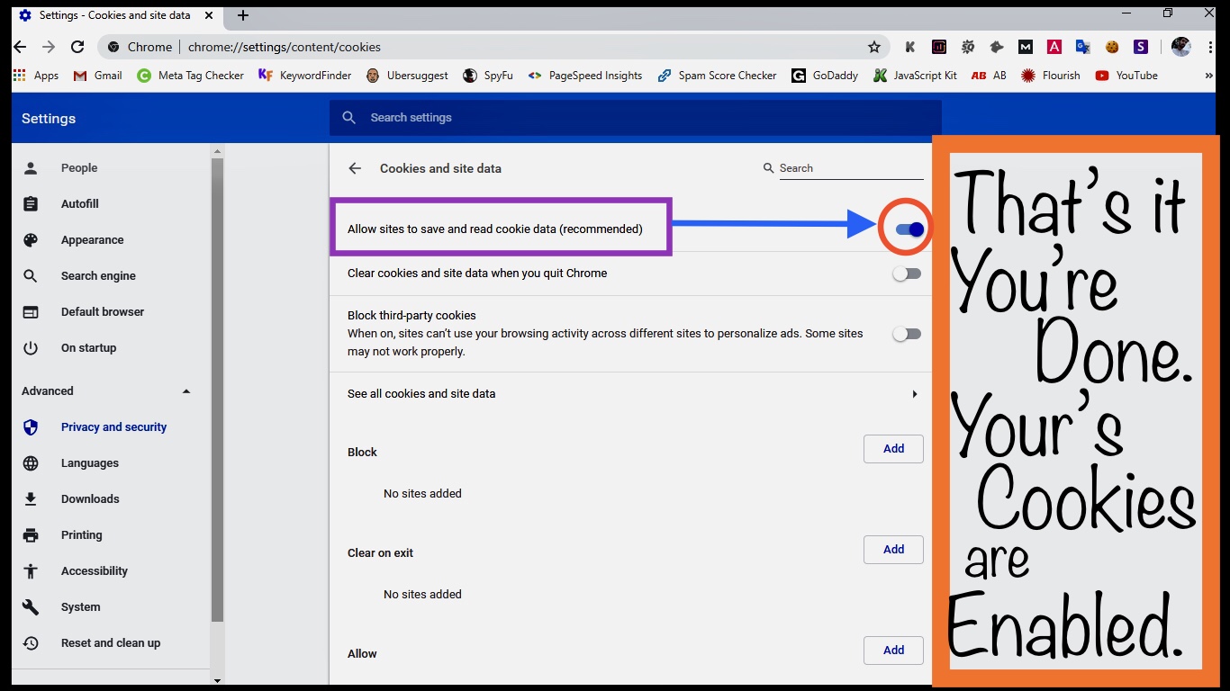 - ● That's it. You have successfully enabled cookies on chrome. By doing this you will allow the visited site to save and read cookies data of your activities.