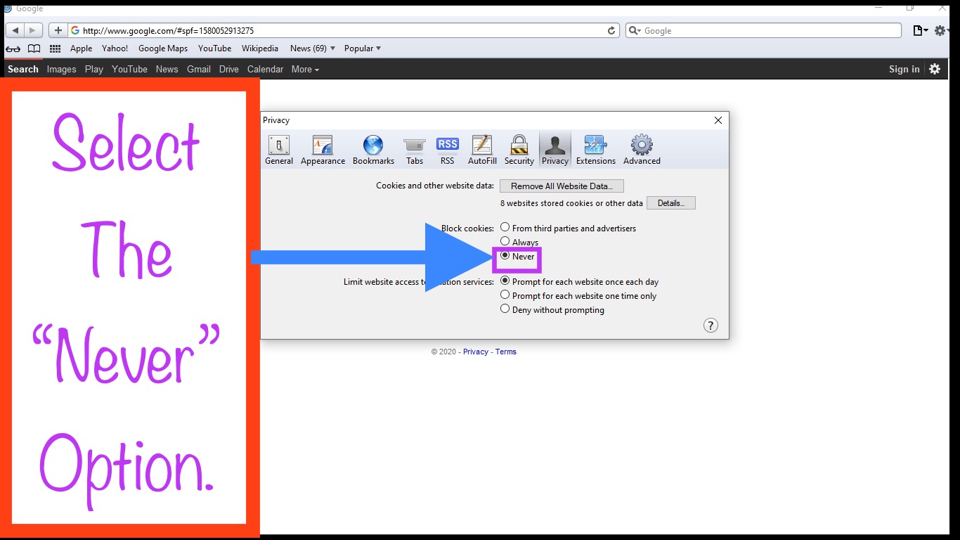 - ● For Lion OS: Pick check the Never option under the "Block Cookies' section.