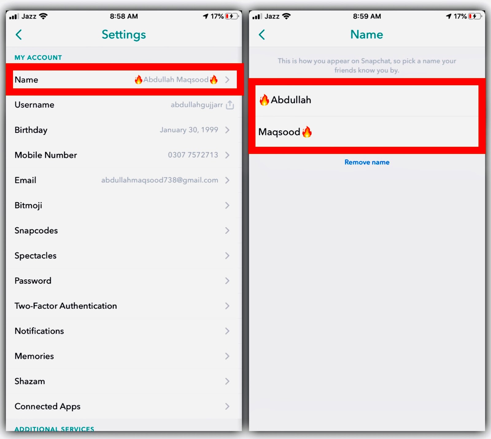 - ● Here you can see my current name is '🔥 Abdullah Maqsood 🔥'.