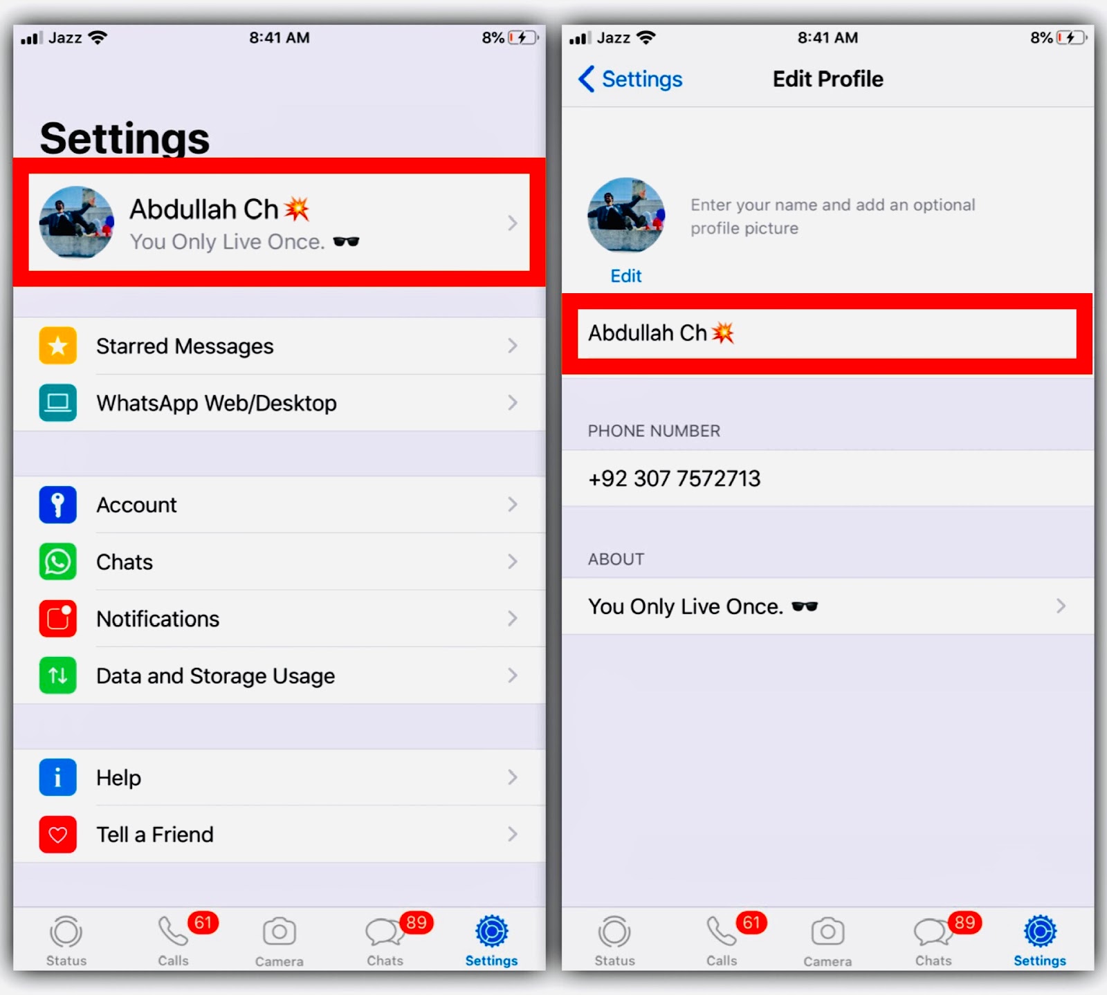 - ● Here you can see my current name is 'Abdullah Ch'.