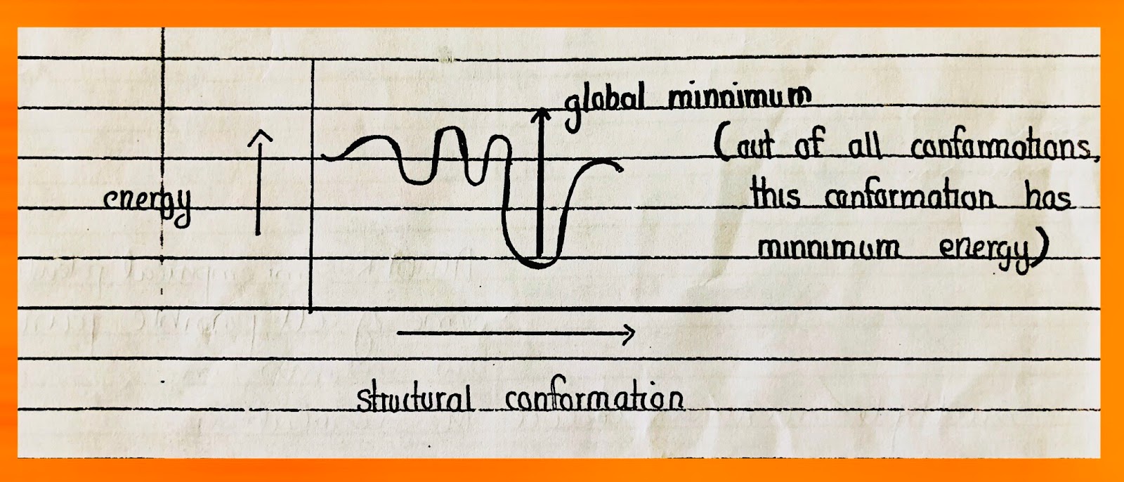 Energy calculation is called Global Minimum. The structure is plotted against, structure on the x-axis and energy on the y-axis. In the graph obtained, the lowest energy will have the deepest peak.