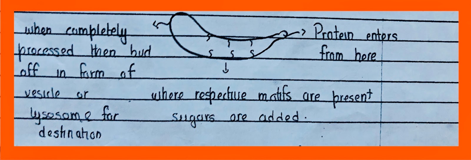 The chain of sugars that is synthesized is also processed. After flipping inside and before transferring to specific protein it is modified i.e trimming of some terminal sugars addition of some others. After transfer, protein folds. Proofreading also occurs here like in replication. Chaperones evaluate protein folding. Check the sugar contents by binding to terminal sugars. Where folding is wrong they change the sugars. When folding is correct the protein goes into Golgi and further modification is O-linked. The O-linked glycosylation sugars are added one by one, unlike N-linked where the whole chain is added.